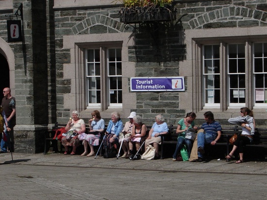 Tavistock oldies enjoying the sun as a wedding entourage forms