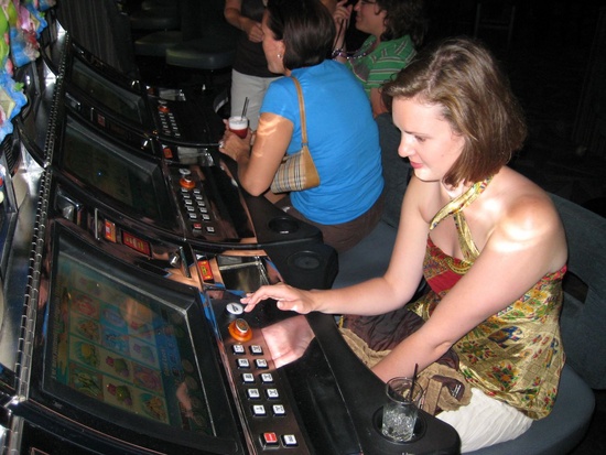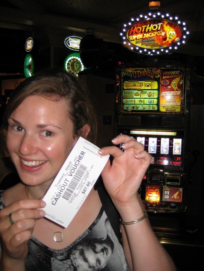 Gini shows off her winnings on the Irish Jigg slot machine.