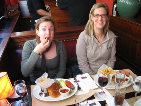 Burgers for lunch. Hom. In a fancy diner under the bridge.