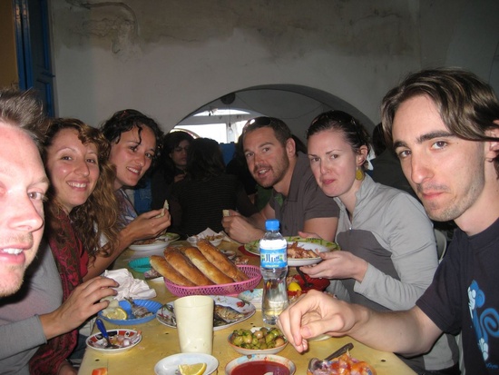 Paul's 30th lunch at the fish market, Essaouira. You choose from the fresh fish and then they cook your fresh fish. Calamari and snapper were amazing. Very raw and gritty after the chow down.
