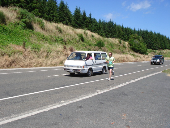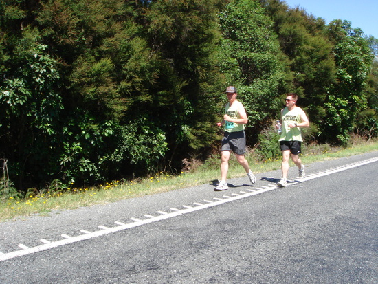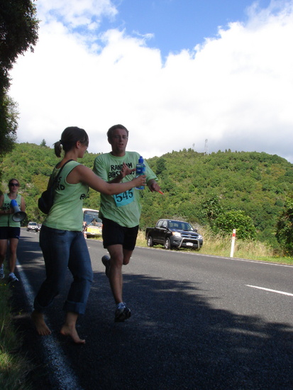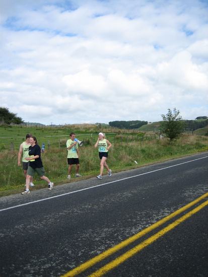 Tom chugs back some water on the run, with support from Gini