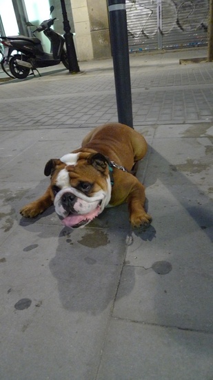 Hilarious bulldog resting his belly on the ground