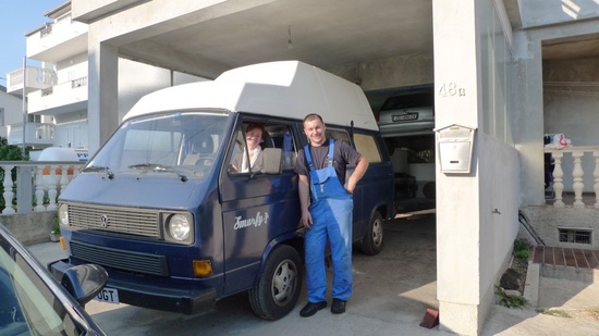 Saying goodbye to Marin, our friendly Croatian mechanic, so we can leave the tent behind for Smurfy once again!
