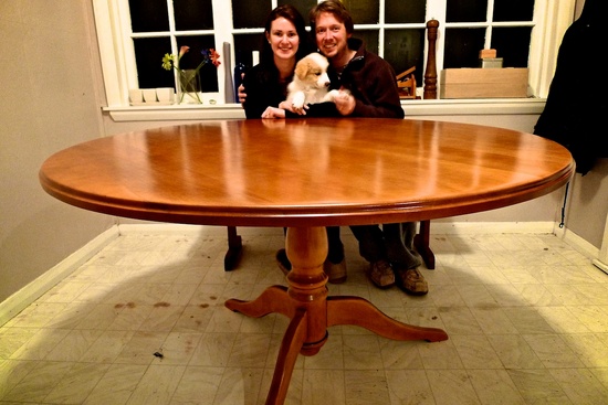 We just got Grandad's table back from having a complete makeover. Doesn't it look shiny! Lyon, no chewing!