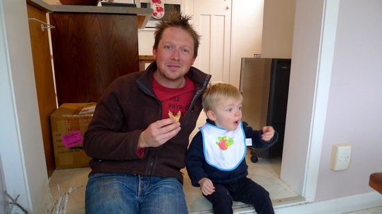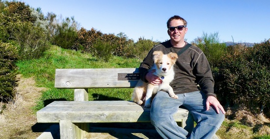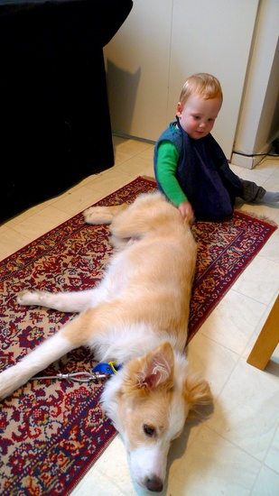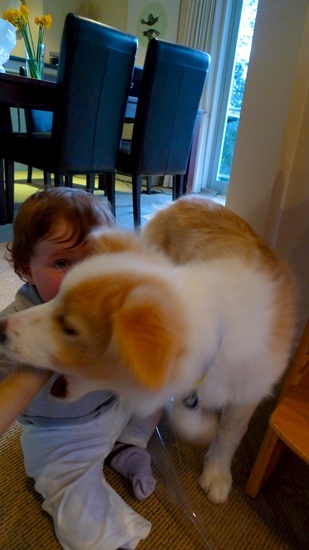 Ben builds up the courage to pat, stroke and pull at Lyon at Tom's Birthday BBQ Bash.