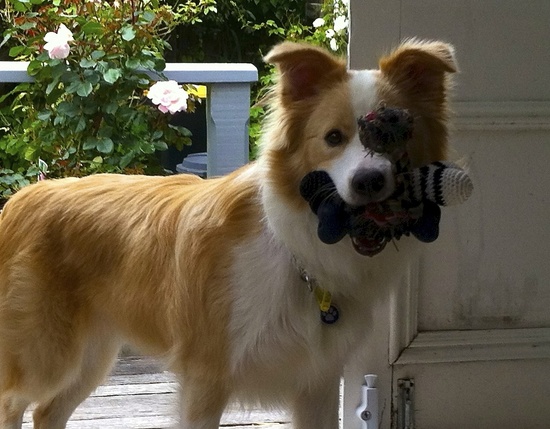 Lyon's new trick - picking up as many toys as possible at one time. His record is three.