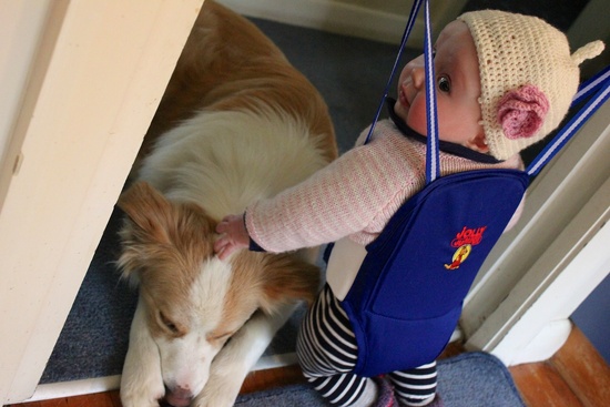 Getting the hang of the jolly jumper. Stinkle wants in on the action too.