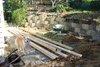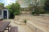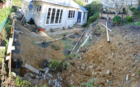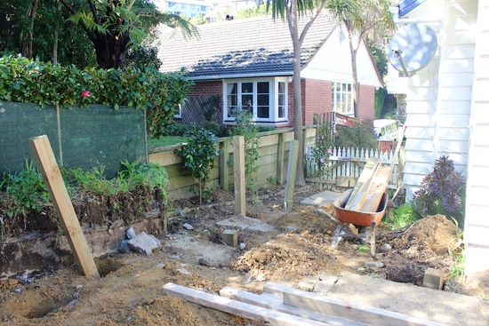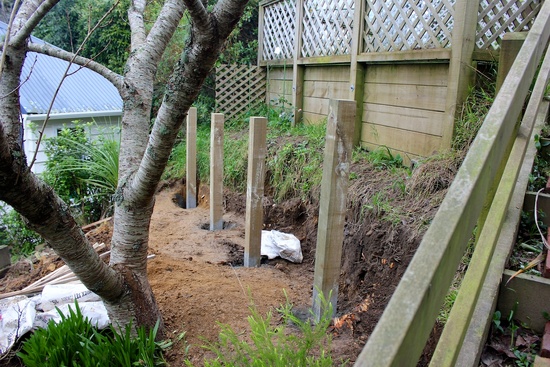 The back retaining wall is up as the first iteration of steps is constructed.