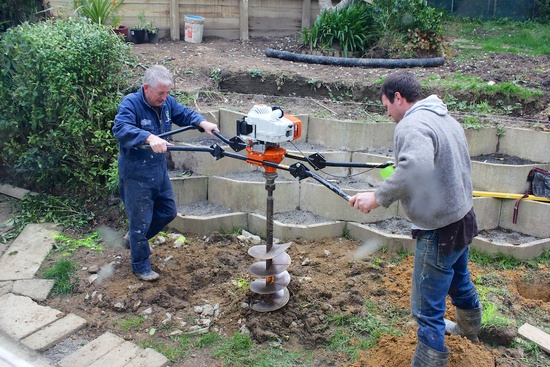 The retaining wall holes get dug