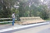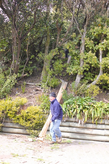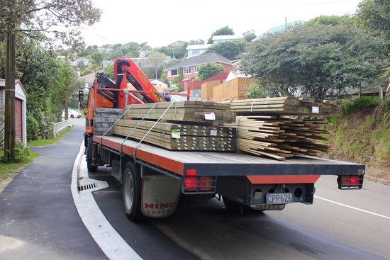 The wood arrives! Too big to fit down the drive, so it is shunted through the bush.
