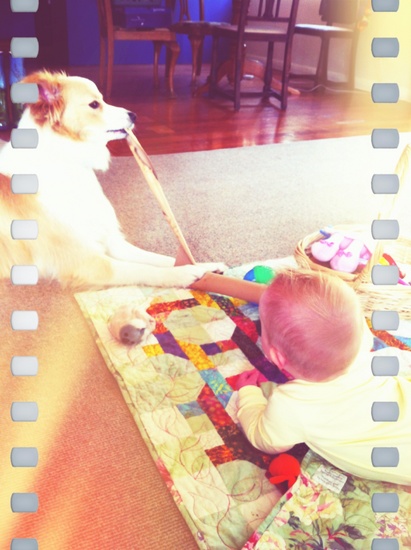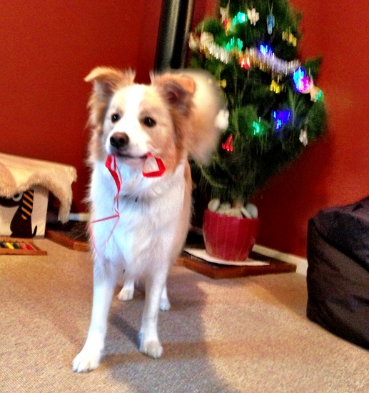 It would seem fur child and olive are already fighting over toys (or wrapping rolls) Lyon won in the end but olive gave a good fight.