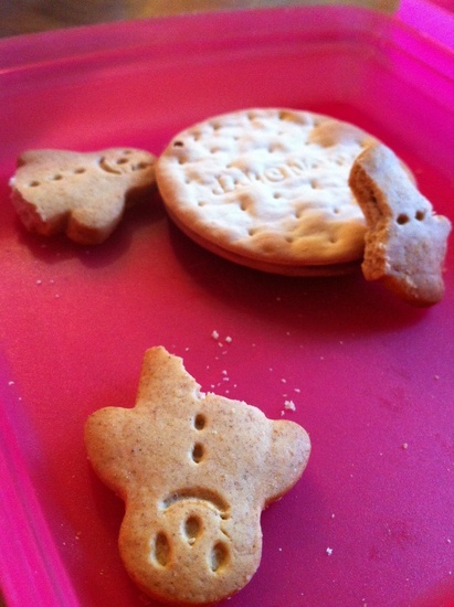 What is with the half eaten gingerbread men Olive? Yesterday at play centre was the first time she was happy sitting without mummy for morning tea, so proud.
