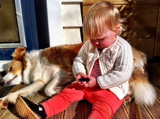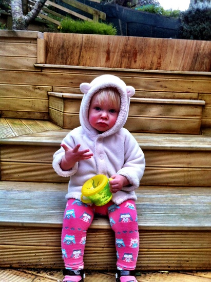 We are back into climbing out the dog/ olive flap. She only came back inside for "pop pop" (popcorn) and then I found her sitting quietly with sidekick Lyon (or scabber) munching on her snack enjoying the great outdoors. I think we have outdoors kid on our hands, every chance she gets, she is out there.
