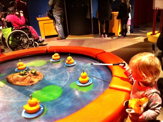 Fishing for ducks, looking in mirrors, playing cafe, digging for balls at science museum in Melbourne.