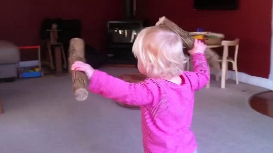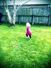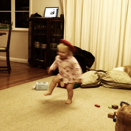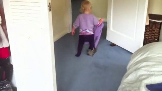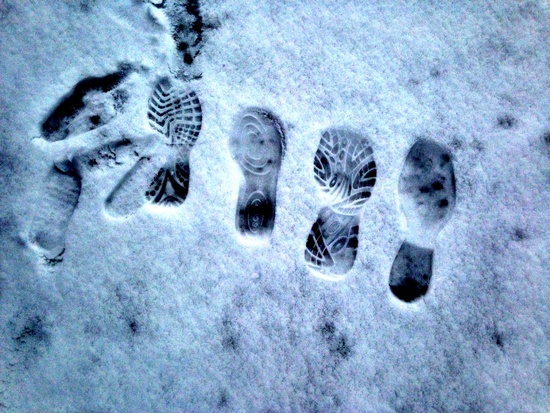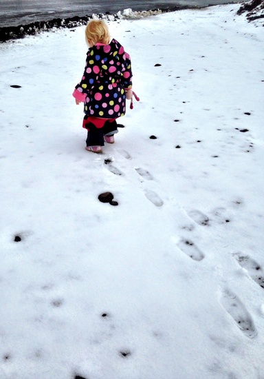 Olives first steps on snow. She was a little apprehensive at first. When asked about the snow later she points to her feet and says "wet!".