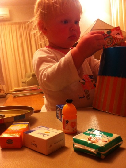 Our new world collection is growing. Very clever brand marketing. Olive can name all the miniatures and was very focused on piling them all up and pouring them into the tin.