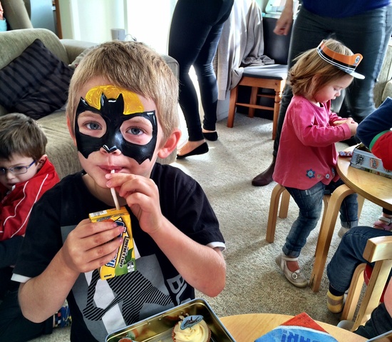 Olive becomes a bumble cat thanks to Catherine at Alex's birthday party.