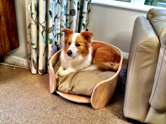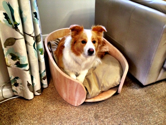 Lyon gets a new dog bed. A work in progress but at least the curtains are now safe!
