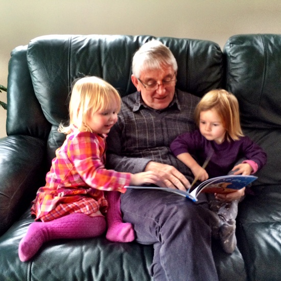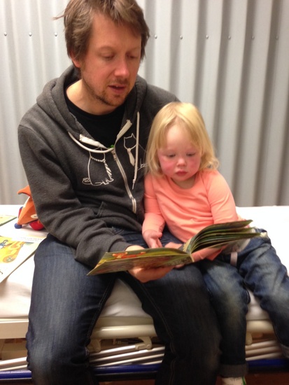 Olive is finally back to her usual happy self after having her worst cold yet. Here she has pulled up a chair to read Iris a story.
