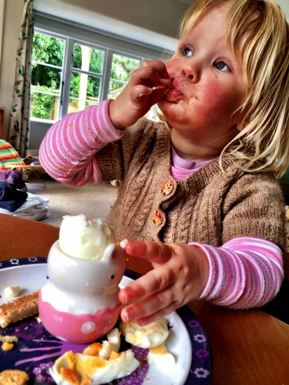 Today Olive had three boiled eggs with soldiers for second lunch after having fish fingers at playgroup. The new egg cup did the trick.