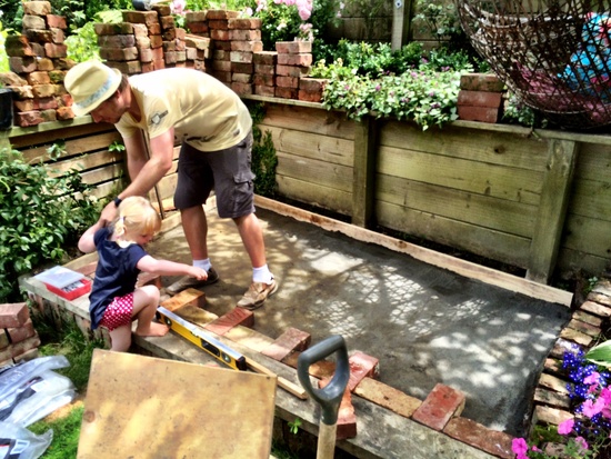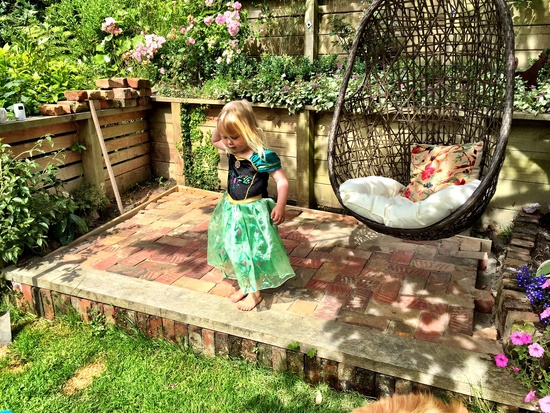 Patio in a day. A warm sunny day hanging in the garden. Iris had her first swing and Olive enjoyed pushing her. Olive enjoyed helping with the sand collection and watching daddy working from the swing chair.