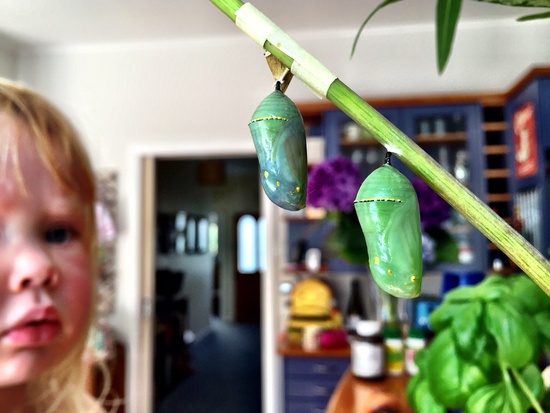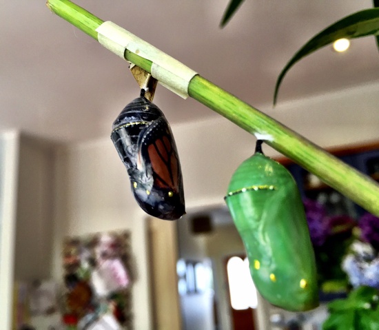 We play the waiting game. It's incredible how identical the chrysalis' are - right down to the gold dots.