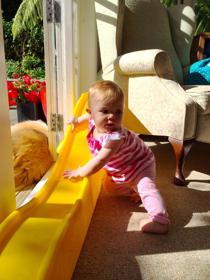 We love to stand. Our little legs are very shaky but it is a thrill to be up. Our favourite tricks are escaping outside and standing at the bath to watch big sister.