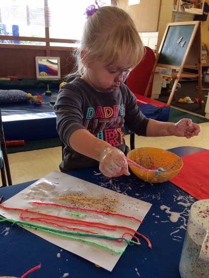 Olive was very unsure of the sensory pathway we did at Playcentre but after one go and enjoying the slime (which was 'like ice skating') she was the last off it. She held onto Sarah's hand and they helped each other through the trays. Don't try this at home! Olive's feet are still red!