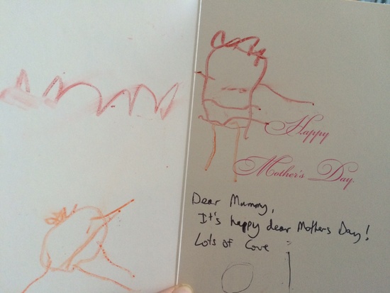 A lovely wake up with Olive so excited to tell me what was on the card and book before I opened it. The card is a treasure. Iris on the left, mummy with lipstick & hair on the right and signed 'o' & 'i' at the bottom. Lovely day with both sets of families.