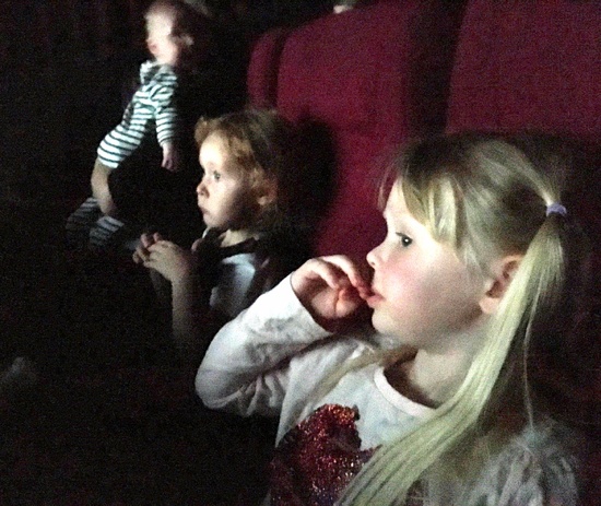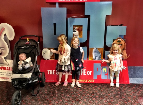 A wet weather day so we ventured to the movies! Pets. Lots of fun and Iris sat through the whole thing on Dads knee.