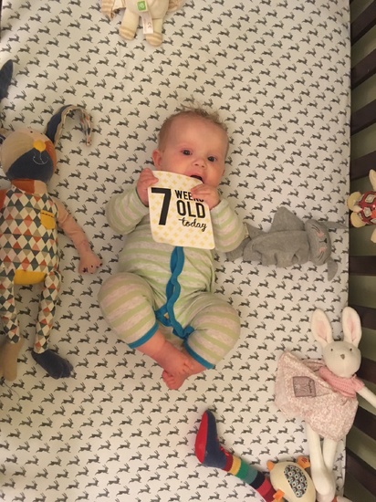 7 months today. In our pjs! And couldn't find the right card! Loving food, hangs on her tummy, interested in everything, thinks her sisters are hilarious, enjoying baths now we can sit (kind of), cut 4 teeth on the top, 2-3naps. Juni is quick to smile or laugh and generally a very cherry little berry.