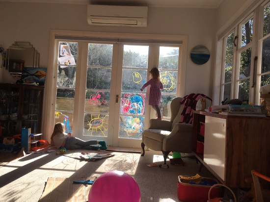 Olive taking Iris through the dozens of birthday cards she'd made for her at school in the weeks leading up to her birthday.