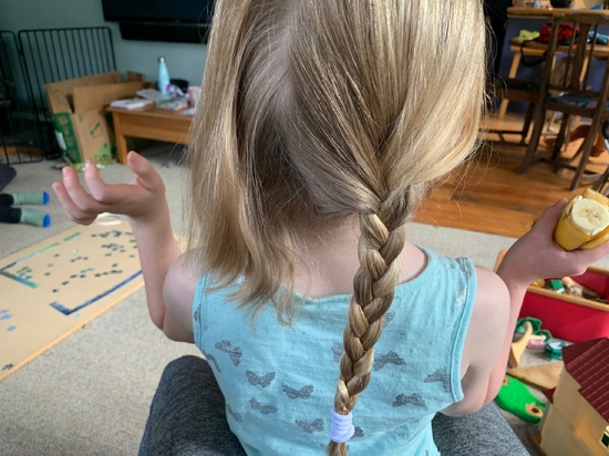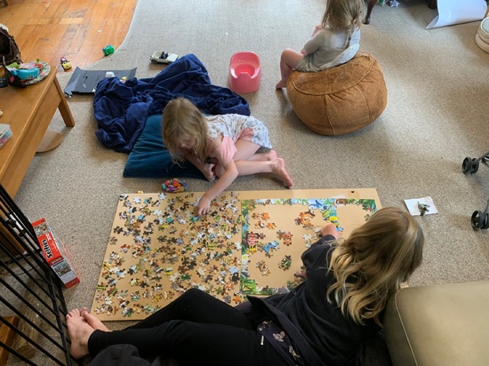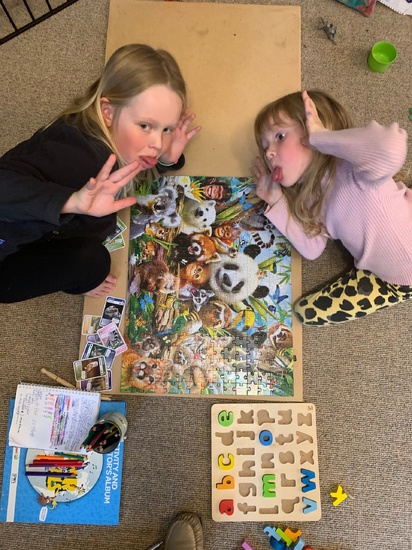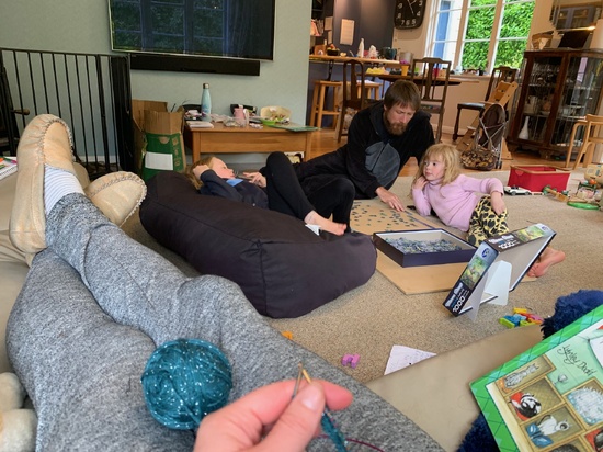 Lockdown day four: finished the puzzle! Started a mega one only to give up! Gave iris a haircut and plaits today keep, started knitting Oli's ombre tunic.