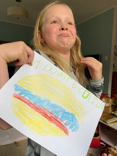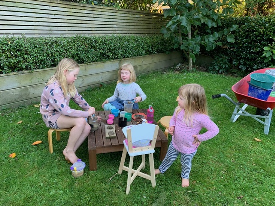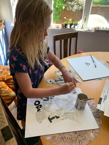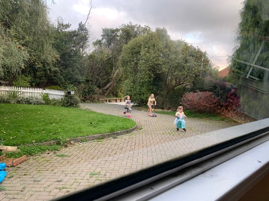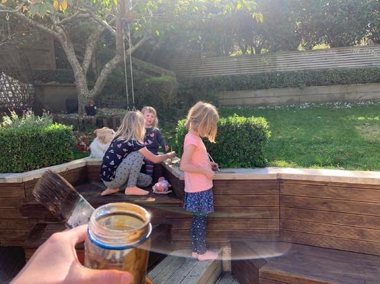 Lockdown day six: girls played mums & dads all morning, Oli read until 10.30! Played four square for PE and biking out the front. Painted some more of the deck while they all painted with water. Which led to face painting. Oli started her sock puppets.