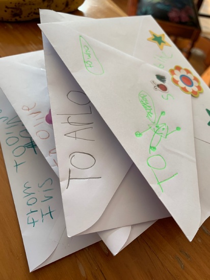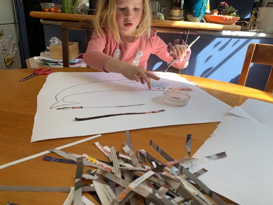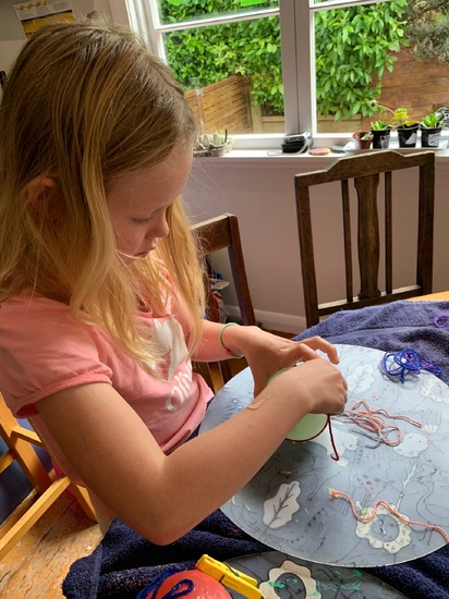 Lockdown day fourteen: making string eggs for Easter hunt. Lots of letter writing to friends, scootering around the busy park and a visit from a kereru.