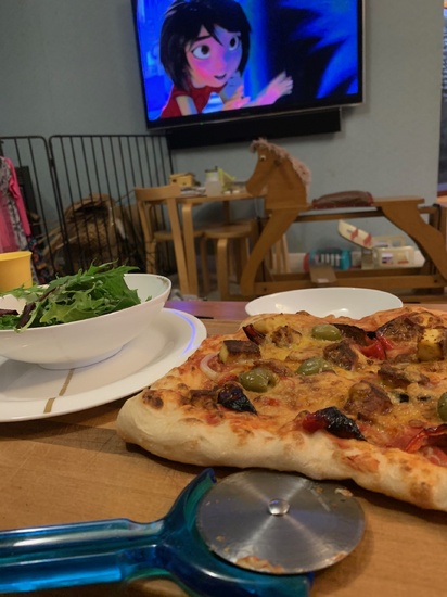 Lockdown day twenty four: Tom places dog poo bucket and tidied under carport with iris. Pizza and family movie night.