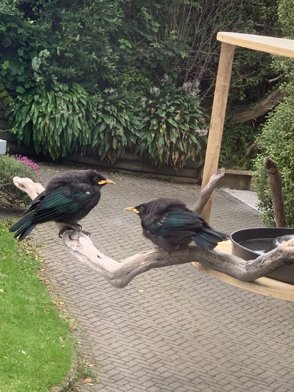 Baby fledgling Tui. Have spent a lot of time on our feeder this last week. Never knew they had orange becks - look more like black birds!