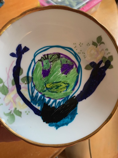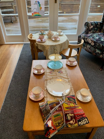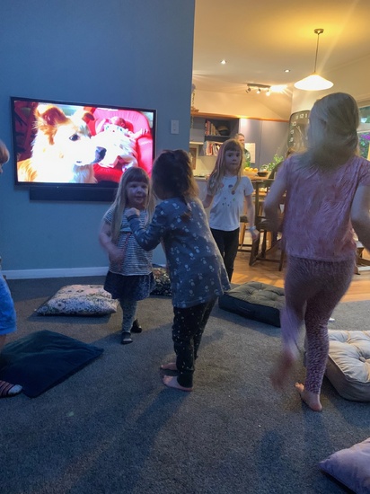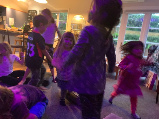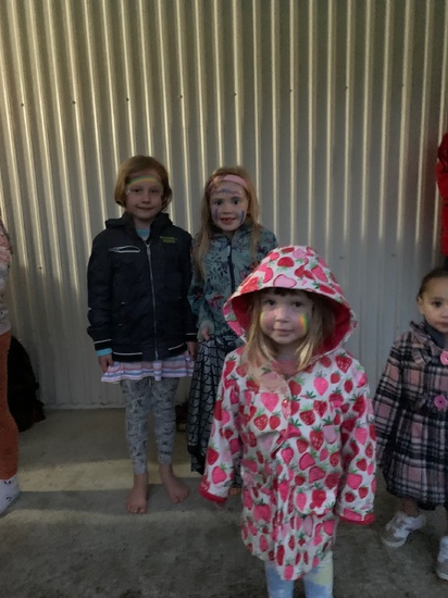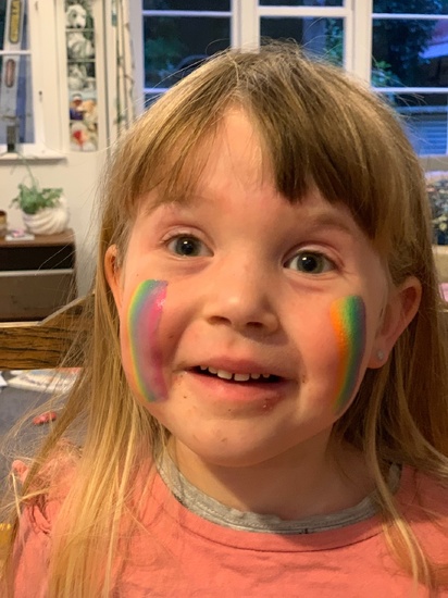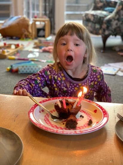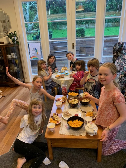 Juni's party. Best friend Maisie, birthday buddy Ivy and cuzzies for a spot of tea and cake. Drawing on plates, followed by pass the parcel, music cushions and pin the horn on the unicorn. Her first party and she loved it.