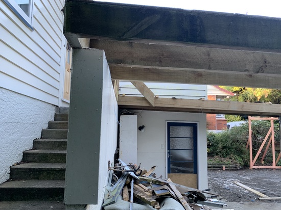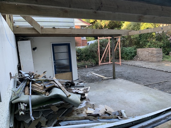 Reno day 3: gutting the two rooms, finding 2 mummified rats and bird nests to boot. Carport roof is no more.