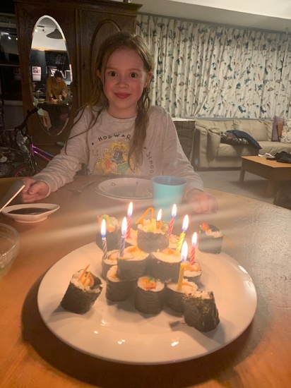 Iris’s birthday now! Loves the kiddypow game console with a few Harry Potter things, Sushi for dinner