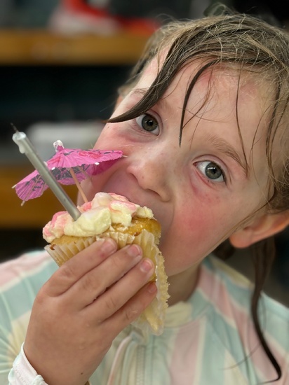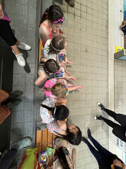 Juni’s early birthday party, at the pool with takeaway snack boxes.