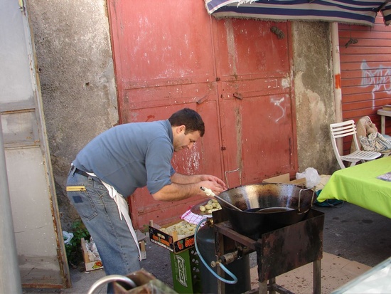 A street food vendor selling deep fried potato balls