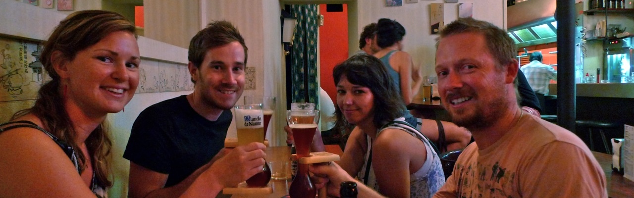 After catching up with Don over a few beers at his funky little apartment, and a much needed shower, we were taken on a short walking tour of his area on our way to Mosquito, a dumpling-slash-beer-brewery-pub where we met Cellina, Don's Spanish girlfriend. Mosquito was fantastic. It had a large menu of ales and other beers - some of which were brewed on the premises and all of which were served in their specific glasses. The dumplings were also great - the first Asian meal of our holiday. We drank and chatted the evening away before slowly walking our way back to Don's flat via a delicious strawberry daiquiri at a funky glowing red bar which I can't remember the name of.