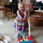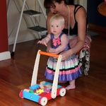 She has gone from crawling to standing holding onto something to walking with the trolly to kamakaze standing unaided for a few seconds at a time in a couple of weeks. She has started using a spoon if we pile the food on, then after licking clean, either throws the spoon to the floor or starts stabbing the rest of the food in her bowl with it. Mealtimes are a mixed bag. Some things get scoffed down in minutes such as risotto, macaroni cheese, mushroom soup, couscous, broccoli, eggplant, rice bubbles (in yoghurt), bananas, raspberries, blueberries and most things that are coated in yoghurt. She usually throws other things on the floor without it even touching her lips - which can be a little embarrassing when we are out and don't have Lyon to clean up after her.