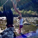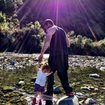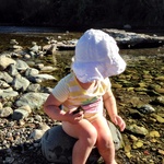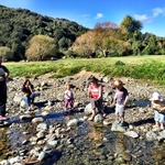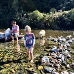 Jen and Dave arrived and had their tent up in no time (having practiced before, up in Taupo). The kids played around in the tents and in the van while we sat around drinking coffee and relaxing in the sun. The campsite sits alongside a stream, where we decided to take a walk so the kids could paddle and sail stick boats. It was such a lovely tranquil setting. Lyon was on his best behaviour. We didn’t need to cable him, and he was quite happy to stay near us, and have a run around with a couple of other dogs who were also camping.