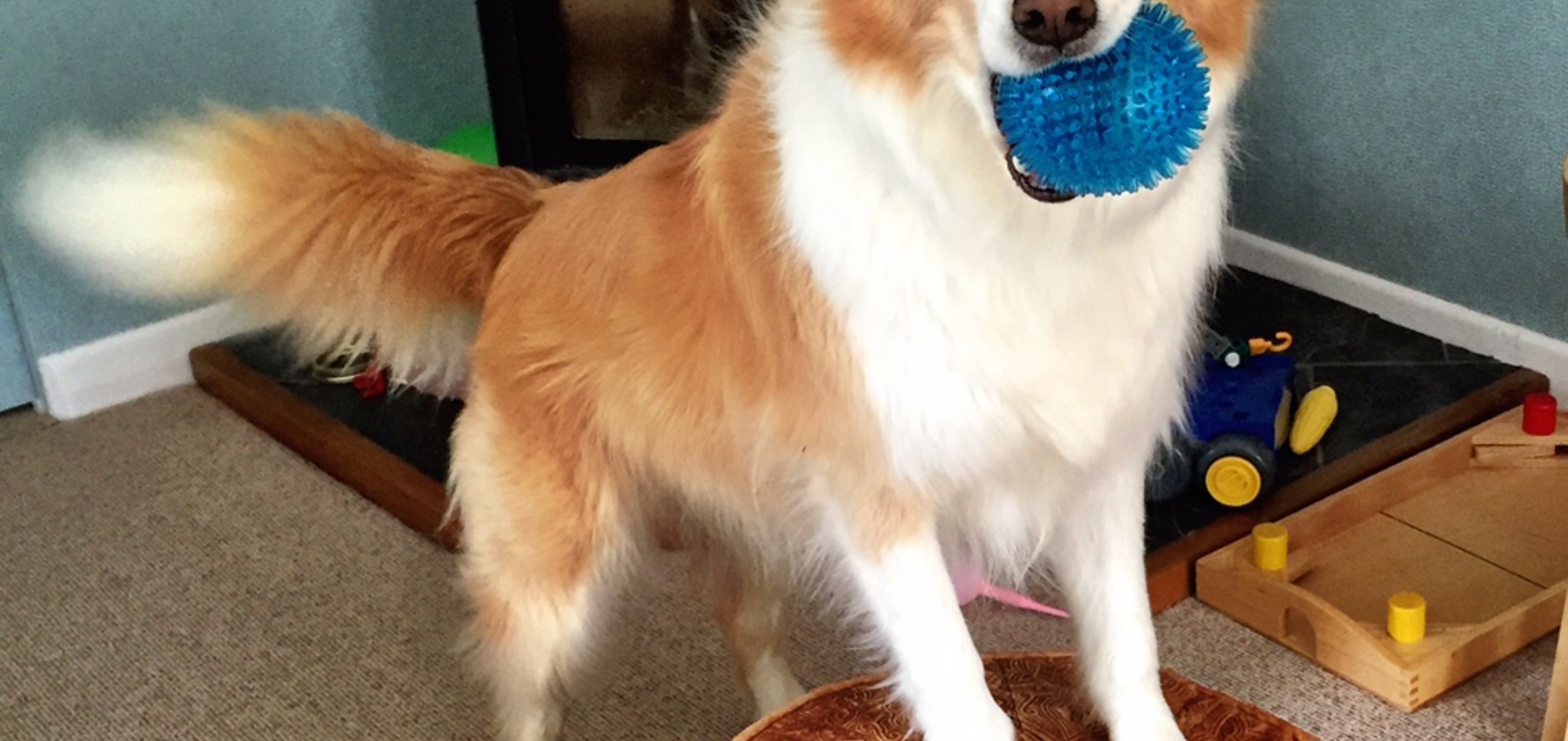 Lyon loves his first new toy in years. Olive wouldn't let us leave the pet store without buying him one.