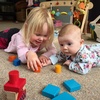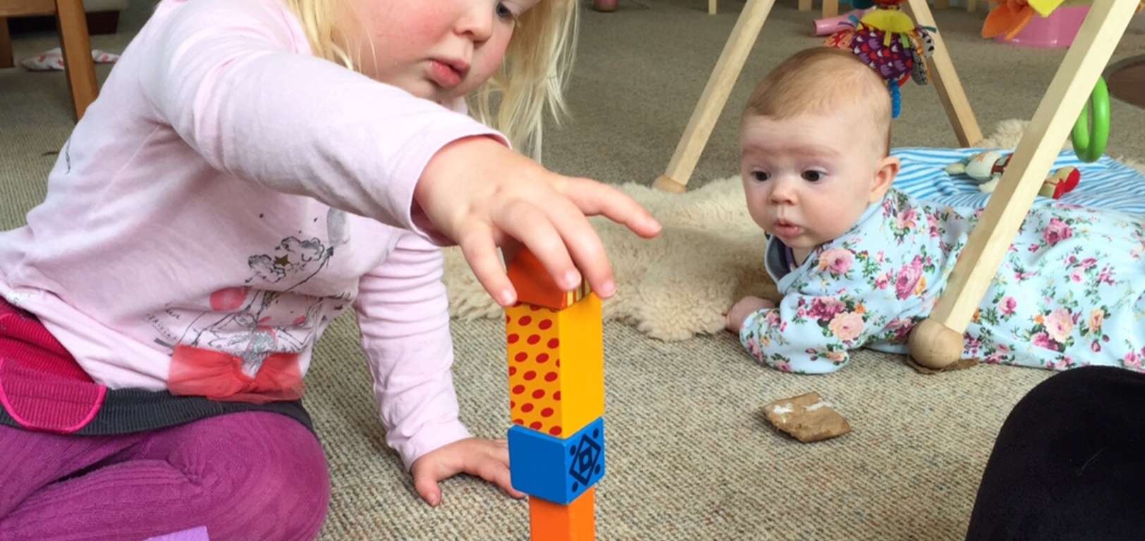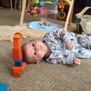 This morning Iris desperately wanted to join us building block towers. So she rolled over to join in.